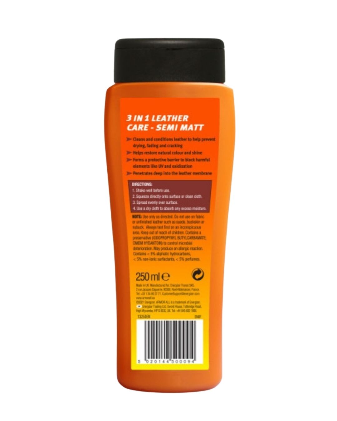 Armor All Препарат за кожа 3 в 1 (250 мл) е професионално разработен продукт, който комбинира почистване, подхранване и защита на кожени повърхности в автомобилния интериор и други кожени аксесоари. Този препарат за кожа ефективно премахва замърсявания и петна, възстановява естествената мекота и блясък на кожата, като същевременно създава защитен слой срещу сушене, напукване и избледняване.