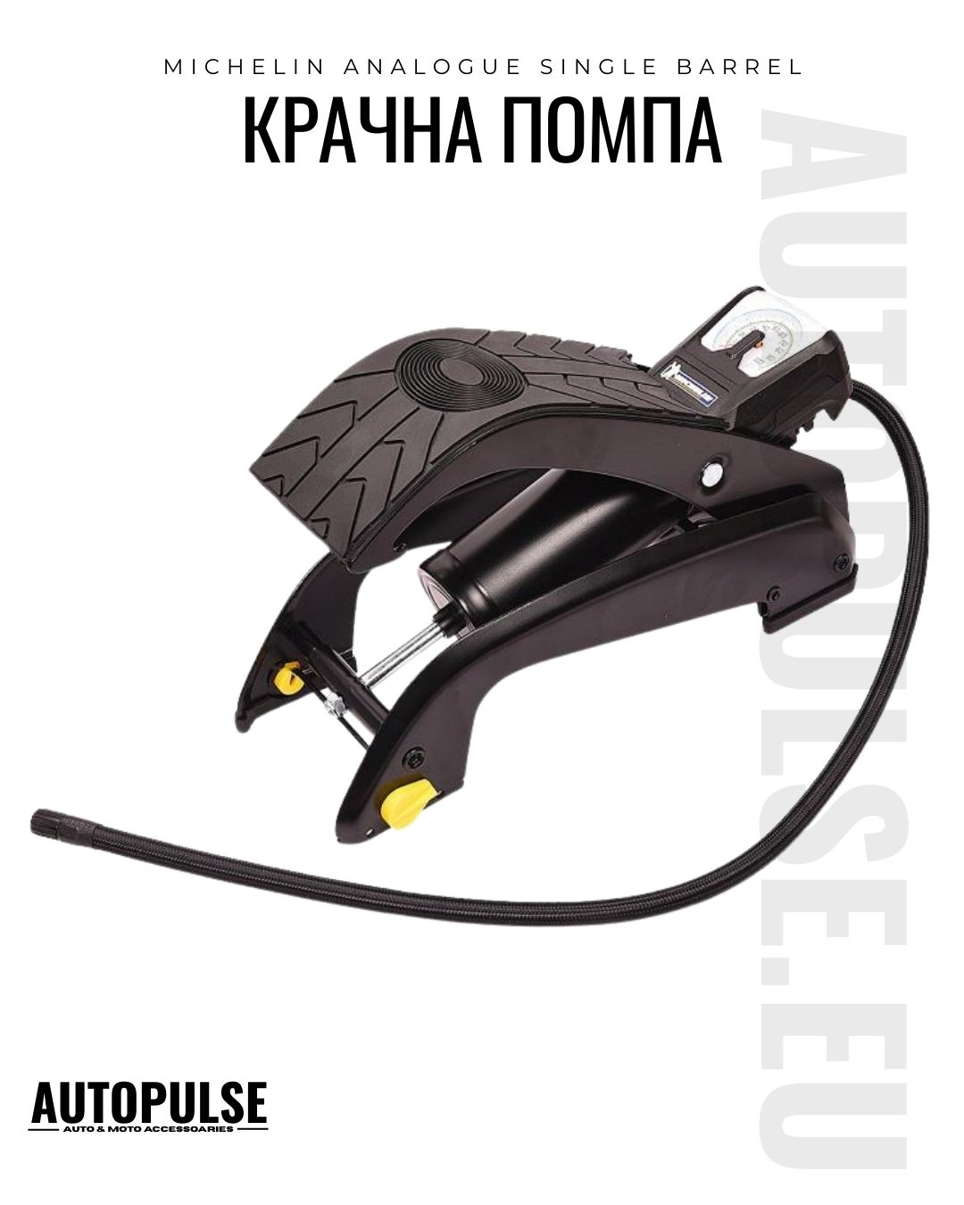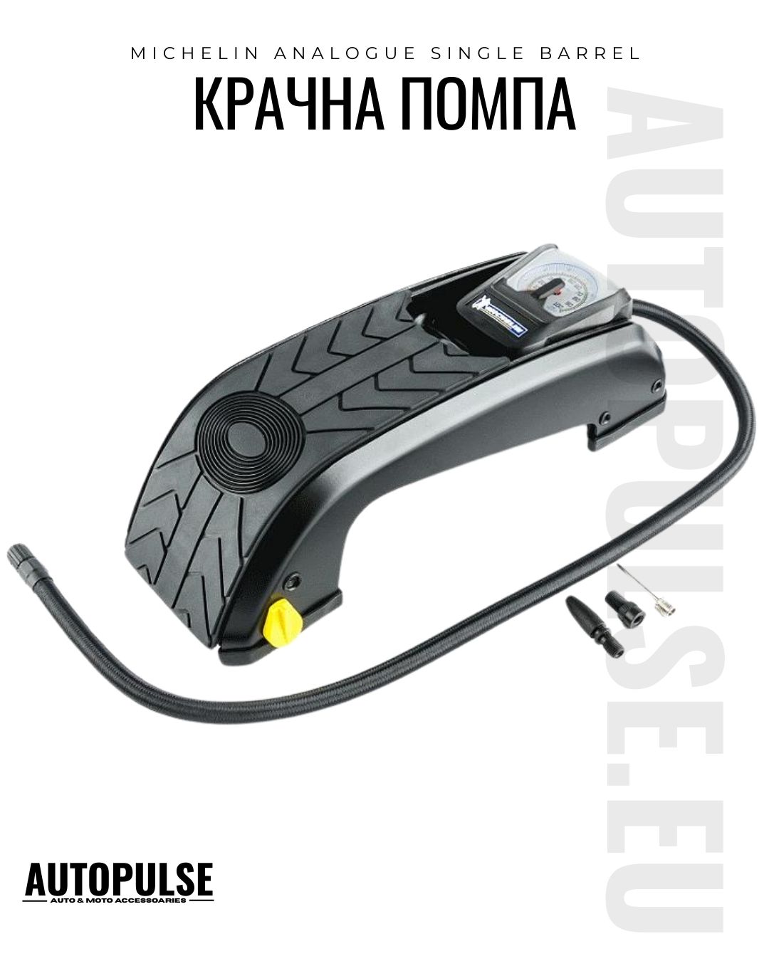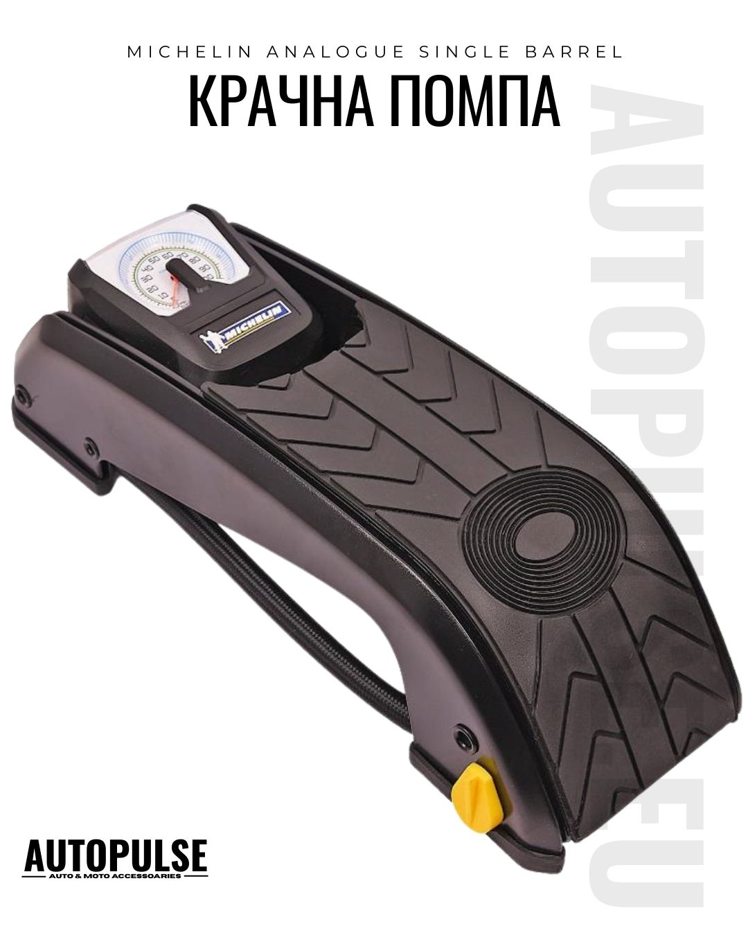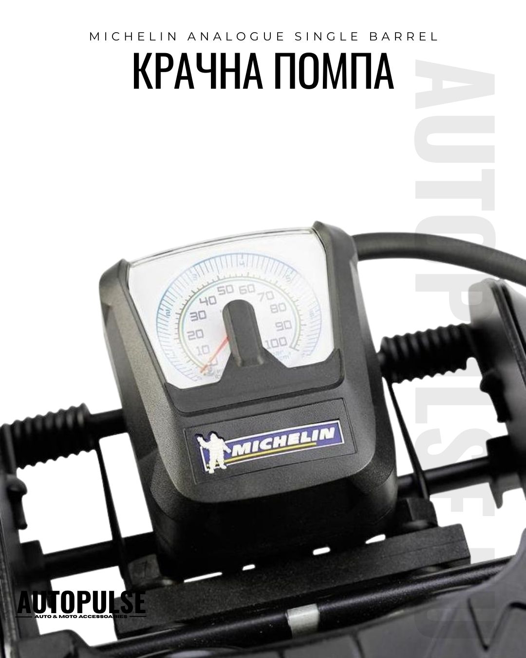 Michelin Analogue Single Barrel е надеждна аналогова крачна помпа с 1 цилиндър и прецизен манометър - идеална за автомобилисти, велосипедисти и аварийни ситуации. Без нужда от електричество, с универсален накрайник и адаптери, тя осигурява бързо и точно напомпване до 7 bar.