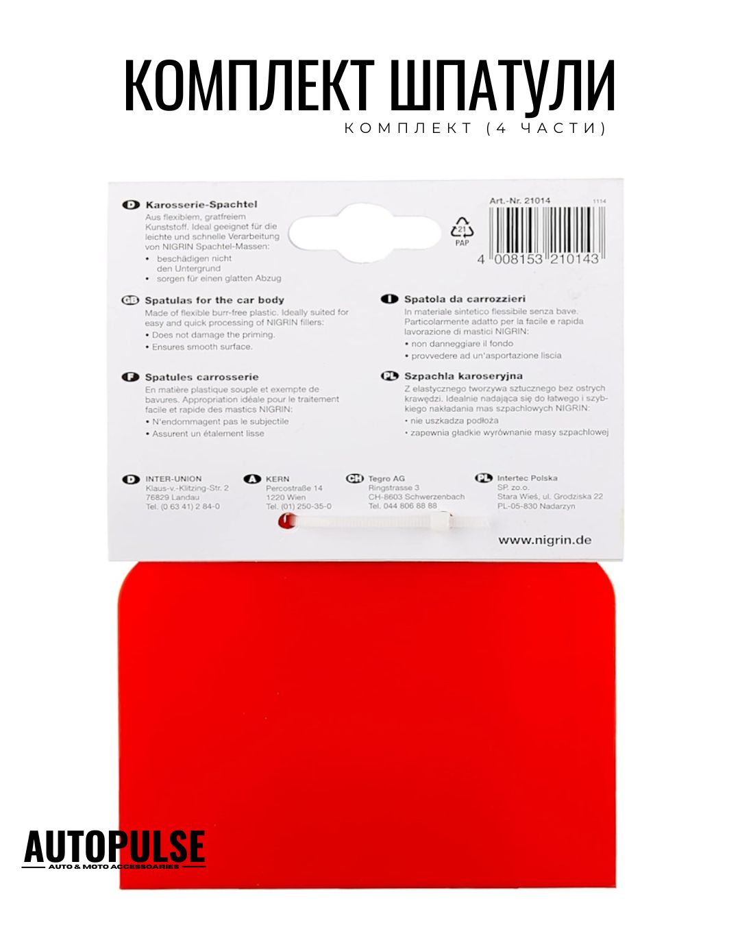 Комплектът шпатули NIGRIN (4 части) е перфектният избор за всеки, който търси лесно, бързо и надеждно решение за изравняване на повърхности. Той е съвкупност от качество, универсалност и практичност, което го прави задължителен инструмент във всеки набор от аксесоари. Доверете се на NIGRIN и постигнете безупречни резултати всеки път.