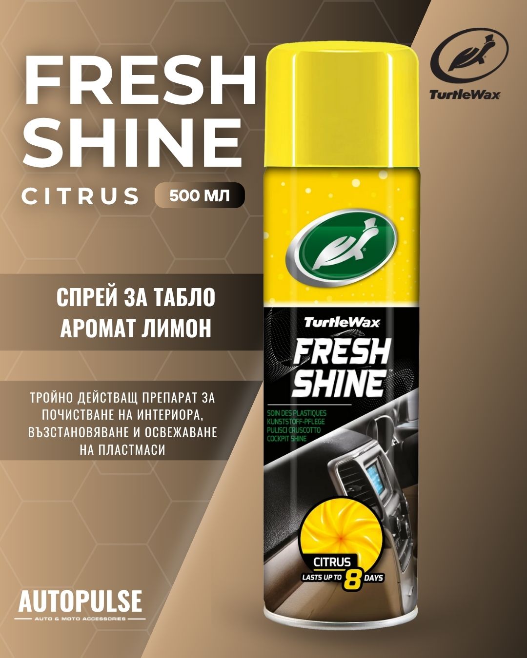 Turtle Wax Fresh Shine Цитрус 500 мл е продукт, разработен с мисъл за най-взискателните потребители и в съответствие с най-новите изисквания за цялостен детайлинг. Той спестява време и усилия, като предоставя три професионални резултата в един аерозол. Инвестирайте в Fresh Shine и осигурете на Вашия автомобил не само чист, но и трайно защитен интериор, обвит в енергизиращ аромат.