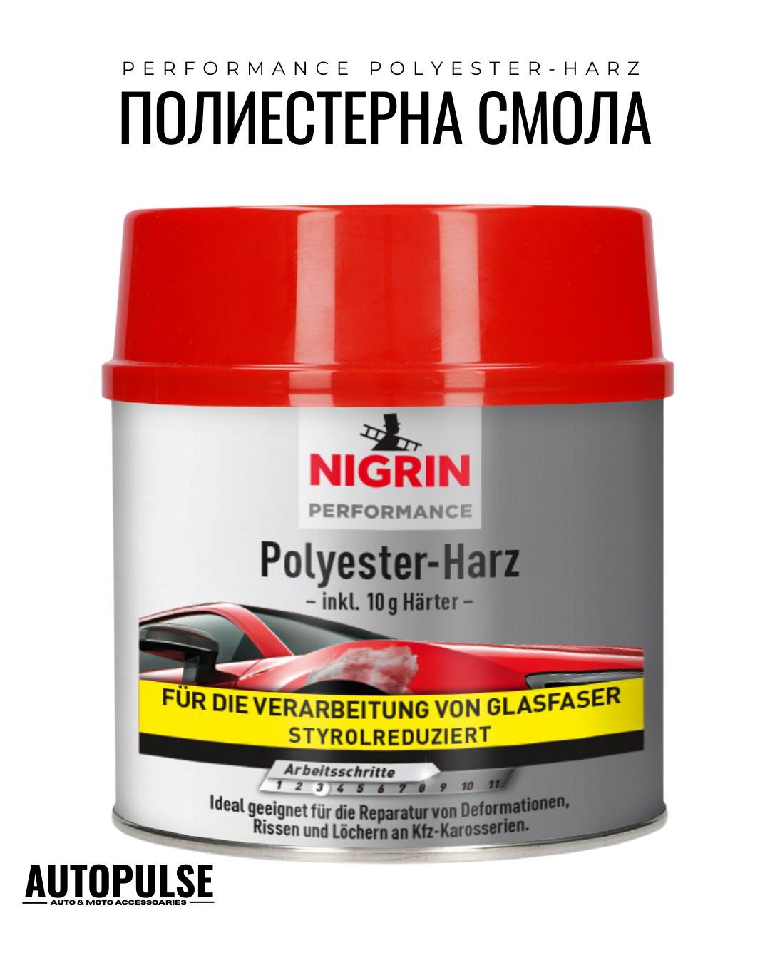 Nigrin Performance Polyester-Harz е специално разработена за работа с фибростъкло (матия, тъкан или вълна) при големи структурни ремонти на каросерията. Тя е еластична, устойчива на вибрации и трептения, и осигурява оптимално сцепление – перфектна за автомобили, мотоциклети, каравани и лодки.
